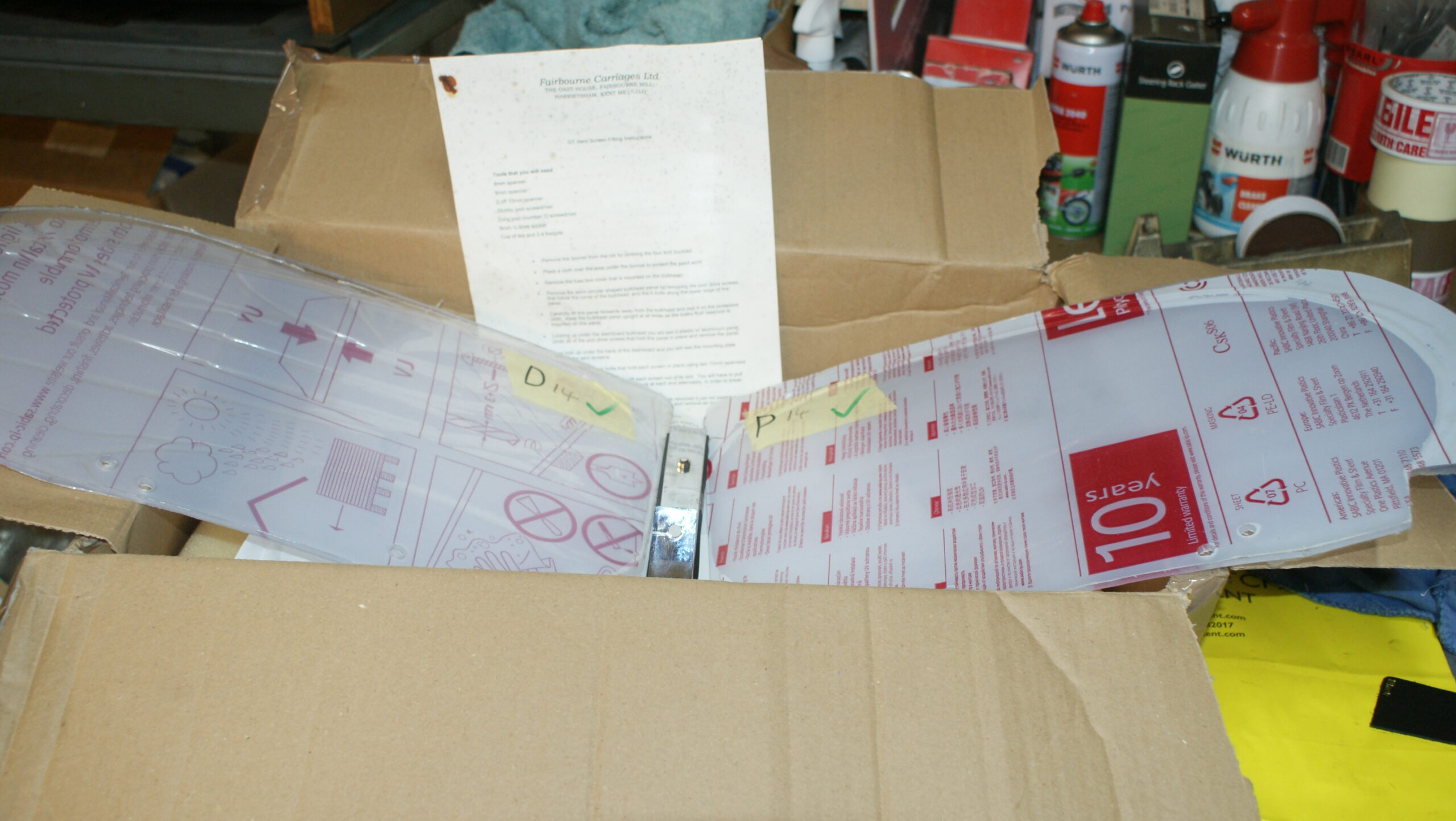 In the box – driver and passenger screens, central divider with rubber seals, leather patch ( cut to size – protects paintwork by sitting between central divider and body tub) and fitting instructions.